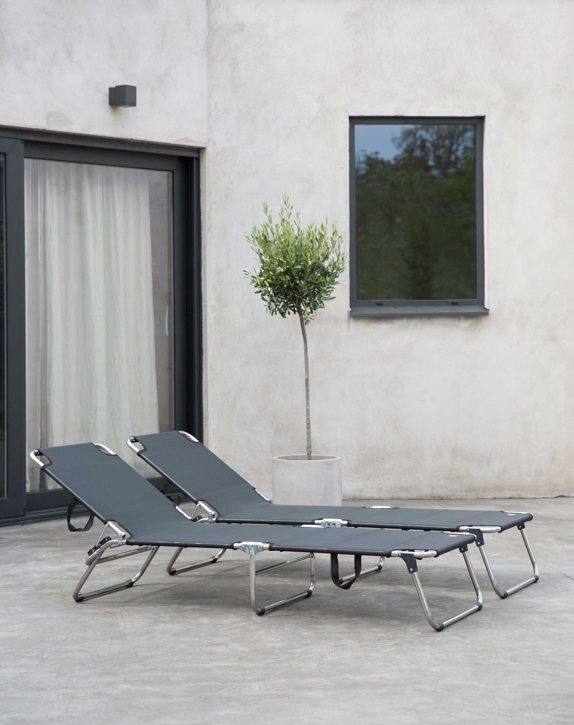 Amigo solseng fra Fiam. Klassisk solseng som kan foldes sammen. Den er fremstillet af aluminium og tekstil. Rygstøtten kan justeres i fire forskellige niveauer. En solseng som er perfekt at bære til stranden. Nakkepude er ikke inkluderet.