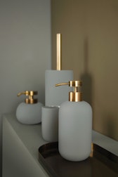 Sæben er en vigtig del i et badeværelse så hvorfor ikke opbevare den i en flot sæbepumpe eller på et flot fad? En beholder af cement, marmor, porcelæn eller plastik bliver en flot detalje. Når sæben er slut er det let at fylde den på igen.