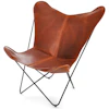 Papillon lænestol fra OX, Denmarq, designet af Dennis Marquart. Lænestolen i cognacsfarvet læder er også kendt som den klassiske "Flagermusstol" på grund at dens specielle udseeende. Lænestolen bliver et blikfang i dit hjem som ingen kan modstå, en rigtig klassiker for dets historie. Konstruktionen er enkel og samtidig elegant - lænestolen består af en sortlakeret stålkonstruktion med et sæde i 100 % garvet vegetabilisk læder med en tykkelse på midnst 3 mm. Eftersom læderet er et naturmateriale så kan naturlige brister forekomme. Med tiden gør lys og brug at læderet for en dybde og en glans i takt med at læderet bliver ældre. Regelmæssig vedligeholdelse af læderet anbefales. Beskyttelsesfødder skal monteres på benene.