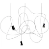 Ingo Maurer har skabt en poetisk lyskilde, hvor et blødt kabel former sig frit til en cirkulær, fjedrende struktur i sort. Den asymmetriske lampeskærm i anodiseret aluminium giver et retningsbestemt lys uden at dominere udtrykket, og den ændrer sig visuelt afhængigt af beskuerens vinkel - nogle gange som en kegle, andre gange som et skråt rektangel. Resultatet er en unik pendel, der bevæger sig på grænsen mellem belysning og kunstobjekt.