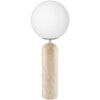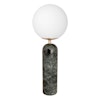 Bordlampe fra Globen Lighting. Bordlampen har et luksuriøst design med en eksklusiv lampefod i natursten, en rund lampeskærm i opalglas og detaljer i metal og en lang ledning med en kontakt og et stik.