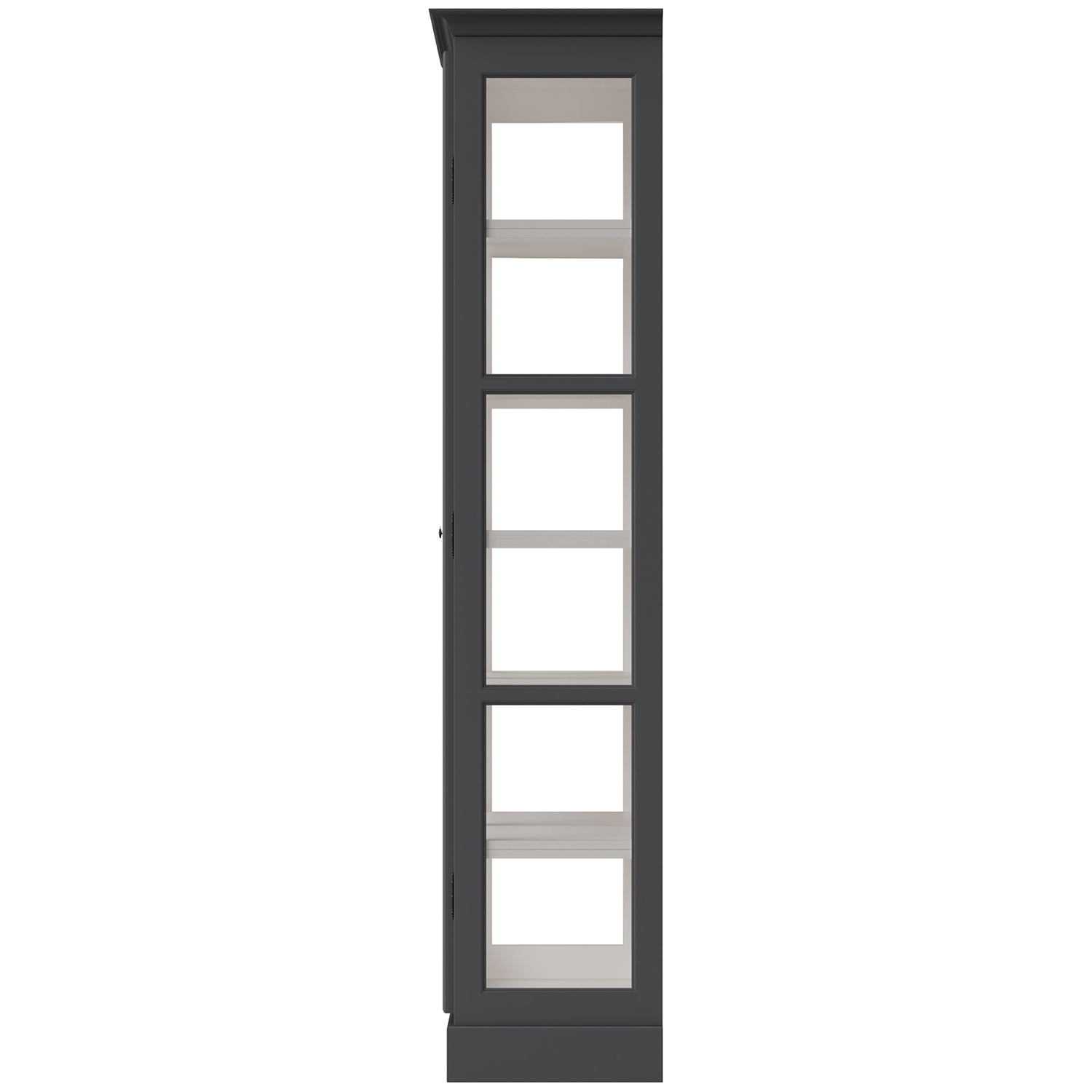 Vitrineskab V2 fra Lindebjerg Design. Et kvalitativt og tidløst vitrineskab af ædel fyrretræ med glas foran og på siderne. Skaber er i fransk stil blandet med det klassiske skandinaviske og er et skab som kan opbevare porcelæn og glas, eller bøger og samling af porcelænsfigurer. Indret din stue eller køkken med skabet for at skabe en moderne med samtidig klassisk stil. Skabet er prydet med jernknop for at åbne dørren højre. Det går at bestille dør som åbner til venstre, det er en specialbestilling med længere bestillingstid. 5 hylder med et afstand på 28 cm mellem hver hylde, dybet på hylden er 38 cm. En farvebøtte indgår med indefarve og en farvebøtte med udefarve for komplettering af skader som kan opstå. Vægt 100 kg.